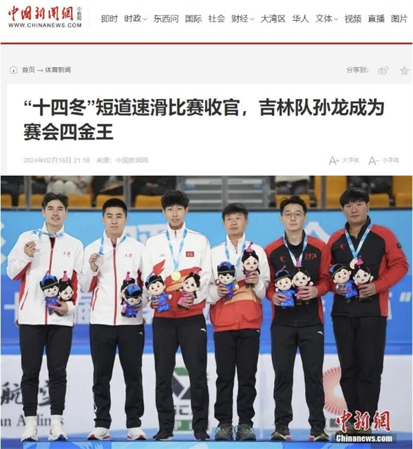 中国新闻网刊发《“十四冬”短道速滑比赛收官,吉林队孙龙成为赛会四金王》《短道速滑男子5000米接力吉林队夺冠 孙龙加冕“四冠王”》《短道速滑男子1000米孙龙夺冠 包揽“十四冬”单项三金》《短道速滑男子5000米接力:吉林队夺冠》。