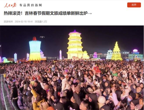 人民网首页刊发《龙年春节假期收官 吉林省文旅市场迎来“开门红”!》,报道2024年春节假期,吉林省多地文旅市场迎来“井喷”式发展,文旅市场创新高;呈现出人气旺、年味浓、体验新等特点。