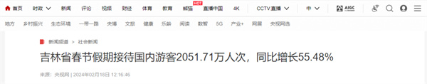 央视网刊发《吉林省春节假期接待国内游客2051.71万人次,同比增长55.48%》,报道吉林省文旅市场迎来“开门红”。
