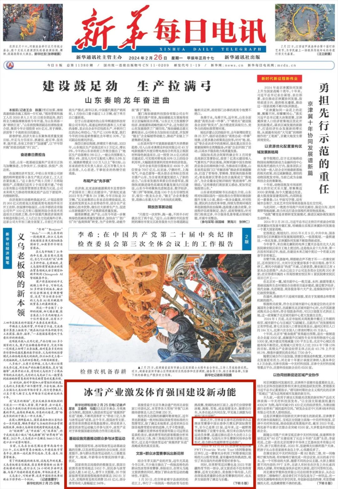 新华每日电讯头版刊发《冰雪产业激发体育强国建设新动能》,其中报道我省举办首届松花江滑冰马拉松挑战赛和长春净月潭瓦萨国际滑雪节,掀起冰雪运动新热潮,助力群众性越野滑雪运动推广。