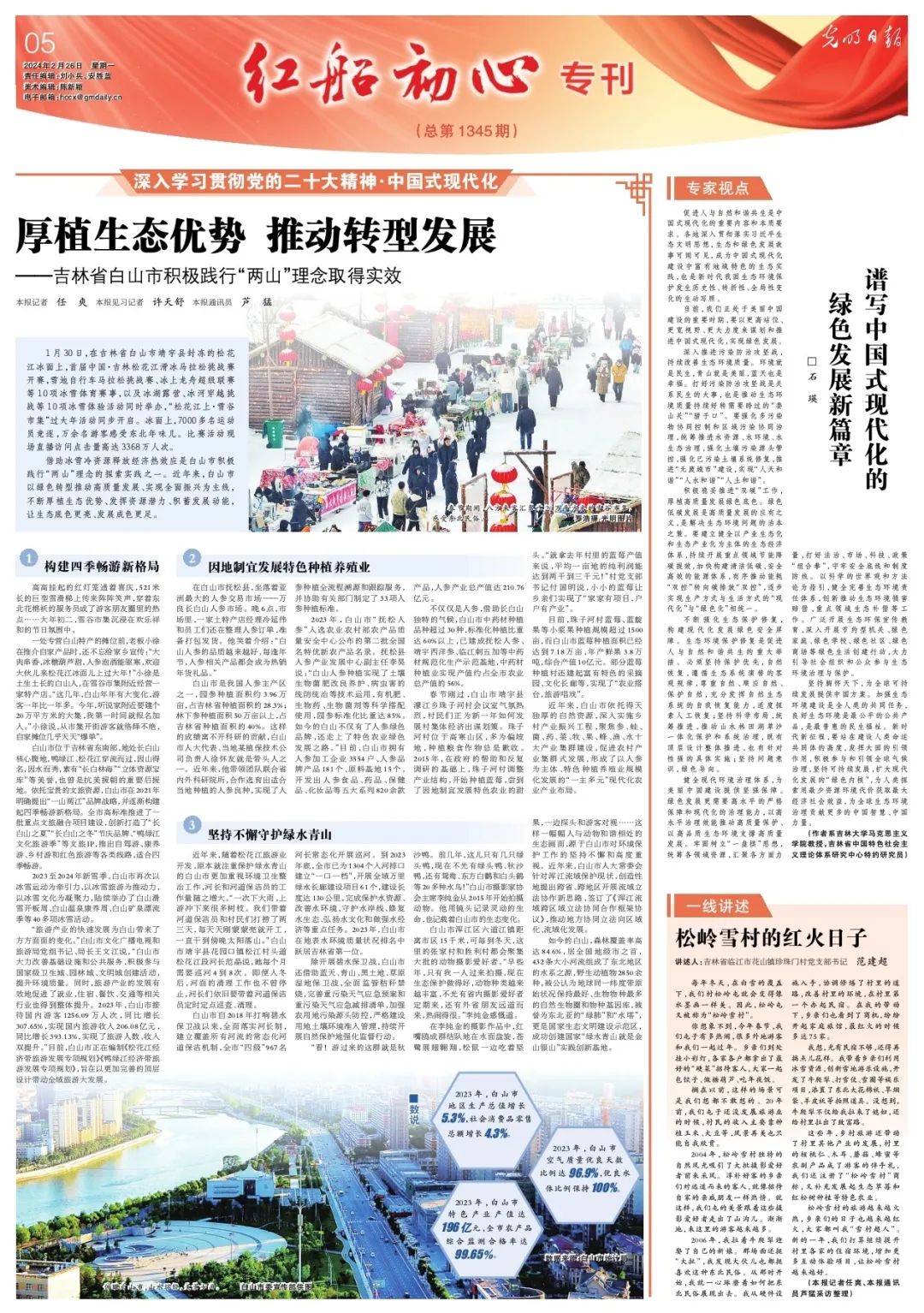 光明日报整版关注白山高质量发展成效,刊发《厚植生态优势 推动转型发展——吉林省白山市积极践行“两山”理念取得实效》《松岭雪村的红火日子 讲述人:吉林省临江市花山镇珍珠门村党支部书记范建超》。