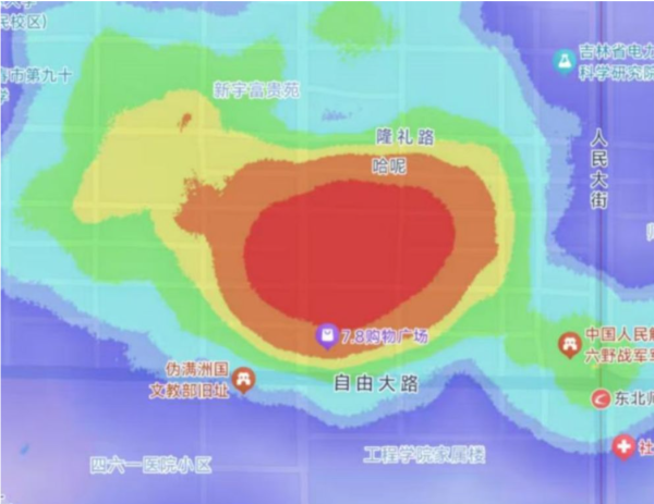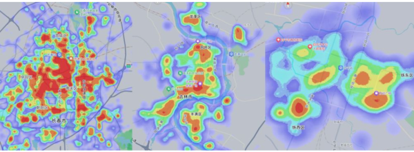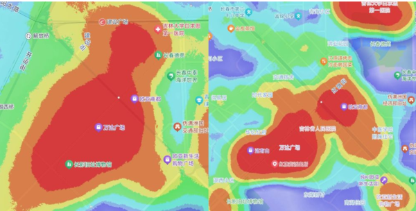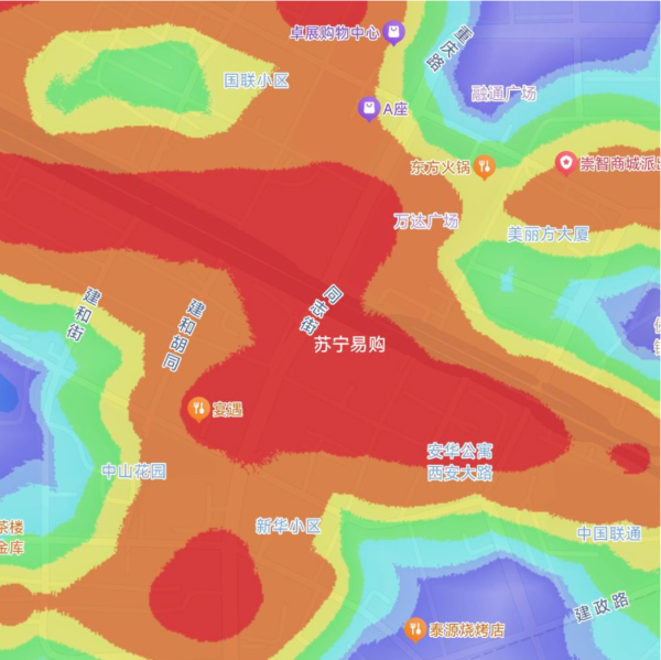 热力图通过颜色的变化,展示所选区域人群密度与活动强度。通过观察区域热力指数,便可以让我们对城市的人口分布及流动情况有较为清晰的认知,也是衡量城市活力的重要标尺。