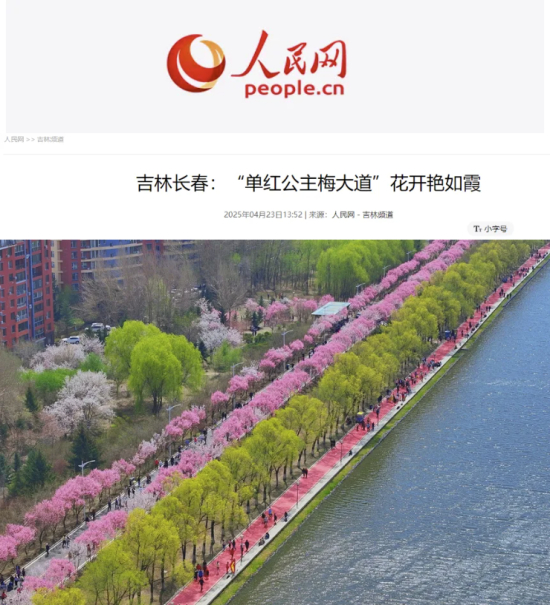 人民网刊发《吉林长春:“单红公主梅大道”花开艳如霞》,报道长春市伊通河畔的梅花大道单红公主梅迎来最佳观赏期,汇成了一条绵延数里的花海长廊,吸引着市民游客共赴“赏花盛宴”。