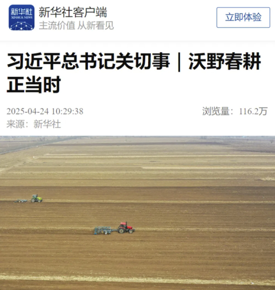 新华社客户端刊发《习近平总书记关切事|沃野春耕正当时》,其中报道吉林省将高标准农田建设作为粮食稳产增产的重要举措,引领种粮大户应用新技术,发展现代农业。去年新建和改造提升高标准农田806万亩、创历史新高,今年力争再建高标准农田1000万亩,不断书写着夯实千亿斤粮的答卷。
