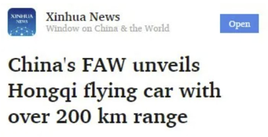 新华社客户端刊发《China's FAW unveils Hongqi flying car with over 200 km range(中国一汽推出续航超过200公里的红旗飞行汽车)》,报道4月23日,中国一汽面向全球发布一款红旗“天辇1号”飞行汽车,其空中续航超过200公里,将于今年实现首飞。
