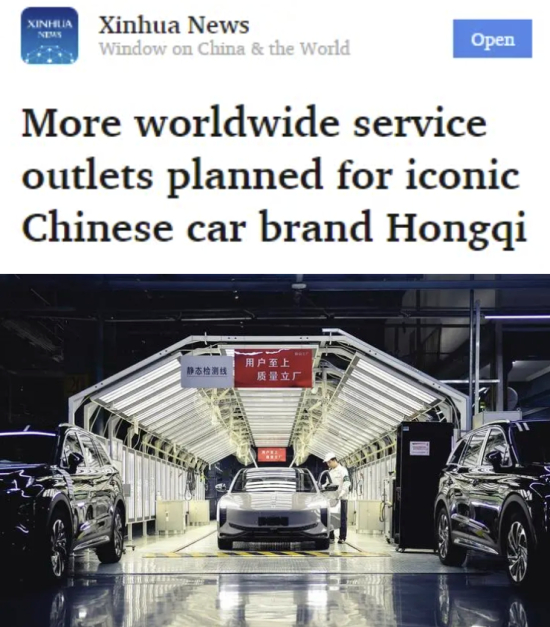 新华社客户端刊发《More worldwide service outlets planned for iconic Chinese car brand Hongqi(中国标志性汽车品牌红旗计划在全球开设更多服务网点)》,报道中国一汽日前宣布一项重大开发计划,将在五年内在100多个国家和地区开设运营1000个销售和服务网点,进一步在国际市场扩大中国汽车品牌的销量和影响力。