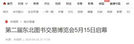 央视网刊发《第二届东北图书交易博览会5月15日启幕》,报道本届书博会将于5月15日至19日在长春农业博览园举办,主会场策展面积达3万平方米,设置18个分会场及10余个线上直播渠道,打造“一核多点、全域沉浸”的阅读盛会。