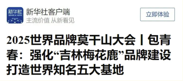 新华社客户端推出《2025世界品牌莫干山大会|包青春:强化“吉林梅花鹿”品牌建设 打造世界知名五大基地》,报道在2025世界品牌莫干山大会“品牌高质量出海论坛”上,吉林省畜牧业管理局局长包青春对吉林梅花鹿产业进行全面推介,计划到2029年末将吉林省打造成全国领先、世界知名的梅花鹿良种繁育、生态养殖、精深加工、交易集散、牧旅融合五大基地,实现从梅花鹿大省向梅花鹿强省跨越。