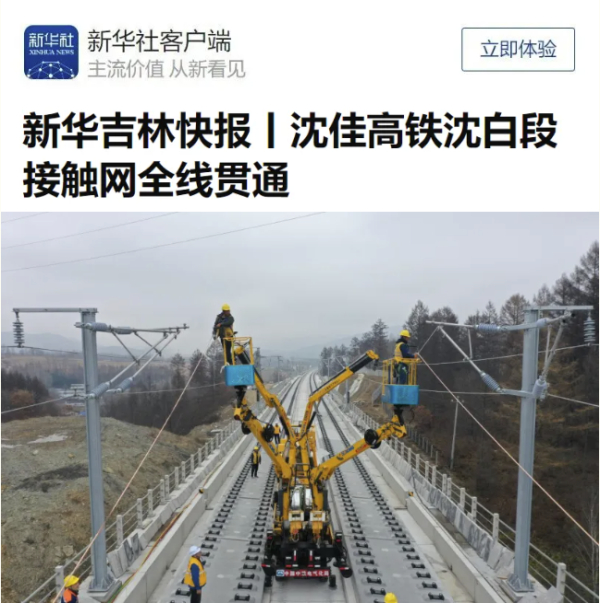 新华社客户端、中国日报网、工人日报客户端推出《新华吉林快报|沈佳高铁沈白段接触网全线贯通》,报道沈佳高铁沈白段吉林省范围内接触网全线贯通,为下一步全线送电和联调联试奠定坚实基础。