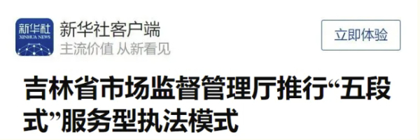 新华社客户端推出《吉林省市场监督管理厅推行“五段式”服务型执法模式》,报道今年以来,吉林省市场监管厅聚焦解决群众与企业急难愁盼问题,全面梳理规范929项行政处罚事项,创新推出法规宣传、教育引导、告诫说理、行政处罚、监督整改“五段式”服务型执法模式,有效激发经营主体活力。