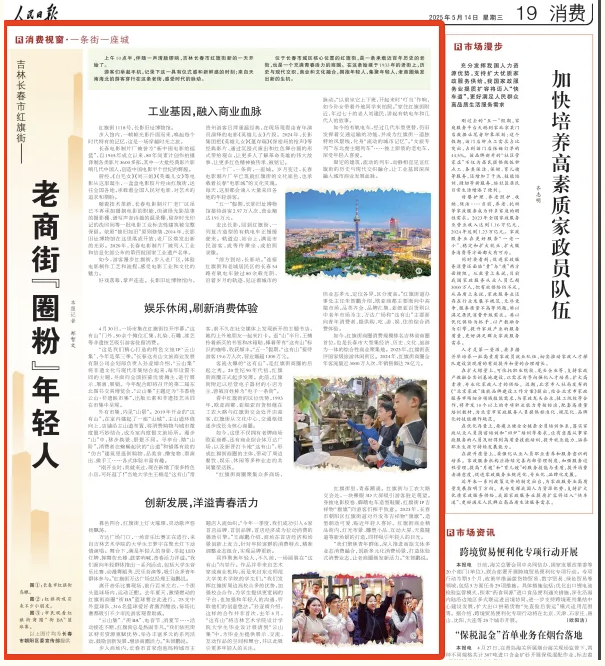 人民日报推出《吉林长春市红旗街——老商街“圈粉”年轻人》,报道承载近百年历史、获评国家级旅游休闲街区的长春市红旗街区,娱乐休闲不断刷新消费体验,长影旧址博物馆释放着我国电影工业和文化的魅力;“这有山”等商圈汇聚了各种非遗技艺吸引游客驻留消费,带动了周边多种业态的繁荣活跃。历史与现代交织、商旅文体多业态消费融合的老商街,创新发展“圈粉”年轻群体,持续焕发出新生机。