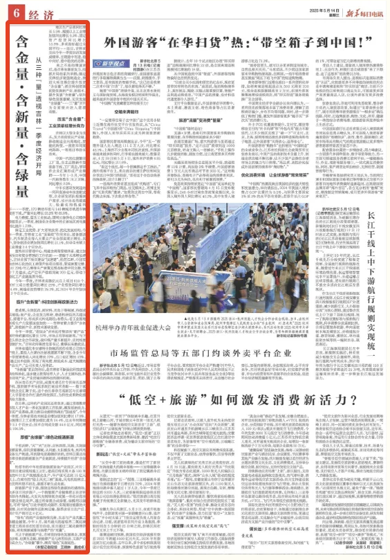 新华每日电讯推出《含金量·含新量·含绿量——从三种“量”透视吉林一季度经济开局》,报道吉林省交出今年一季度经济发展成绩单:地区生产总值同比增长5.5%、规上工业增加值同比增长9.3%、固定资产投资同比增长13.8%、多项指标超过全国平均,体现吉林省锚定实体经济做强制造业,推进大项目落位提升投资“含金量”;抓住科创资源优势发展新产业、新技术,提升发展“含新量”;依托绿色资源禀赋,充实发展“含绿量”,三“量”齐升呈现稳中有进、稳中向好、稳中趋优的态势;推出《新华每日“吉”报(2025年5月14日)》,集纳我省经济社会诸多领域的亮点成就。