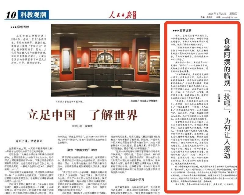 人民日报海外版推出《食堂阿姨的临别“投喂”,为何让人感动》、人民网推出《食堂阿姨一句“好好吃饭”感动全网!背后的美食也藏不住了》,报道在延边大学毕业典礼上,一位食堂阿姨走上讲台,用朴实无华的话语,送出了最特别的临别赠言,后勤所有服务人员加班加点包制了15000个饺子,以生活中的细节堆积和临别的“投喂”践行了“爱的教育”、感动了毕业生和万千网友;人民日报微信公众号推出《在毕业典礼上爆火的食堂阿姨,紧急打假!》,报道食堂阿姨刘晓梅在延边大学毕业典礼上的真情演讲爆火“出圈”后,社交平台上出现了不少冒充她的账号,刘晓梅担心有人上当受骗,因此出面“想提醒大家一下”。