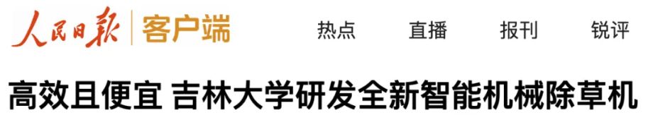 人民日报客户端推出《高效且便宜 吉林大学研发全新智能机械除草机》,报道近日吉林大学科研团队研发出一款智能机械除草机,作业速度4000米每小时,成本低,效率比激光除草机高4倍,突破了国产同类设备只能除行间草的技术瓶颈。
