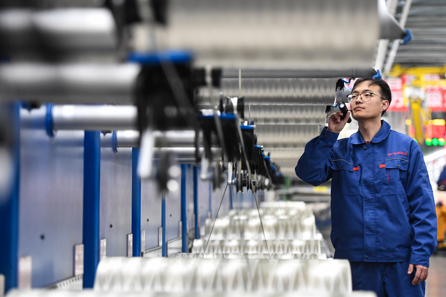 在吉林化纤集团碳纤维原丝生产车间,工作人员查看碳纤维原丝生产质量。张楠 摄