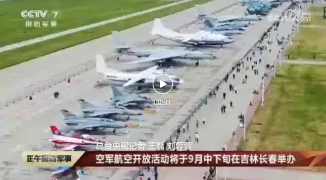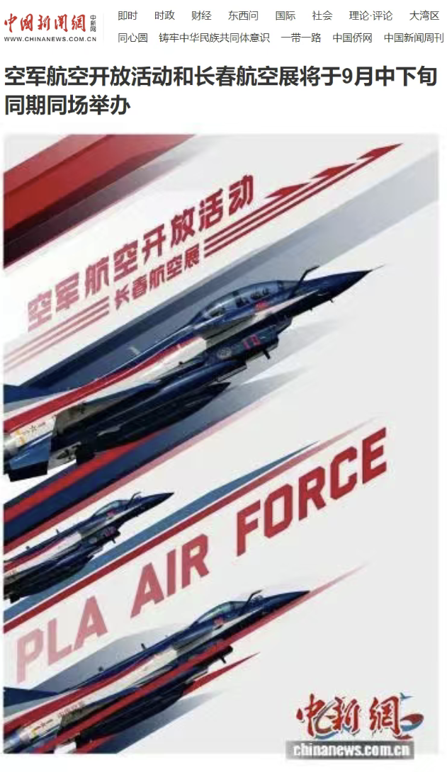 人民日报、人民网、CCTV-7国防军事频道、中国新闻网、中国青年报报道9月19日至23日,空军将在长春市举办“空军航空开放活动”,届时长春市将同场举办“长春航空展”。