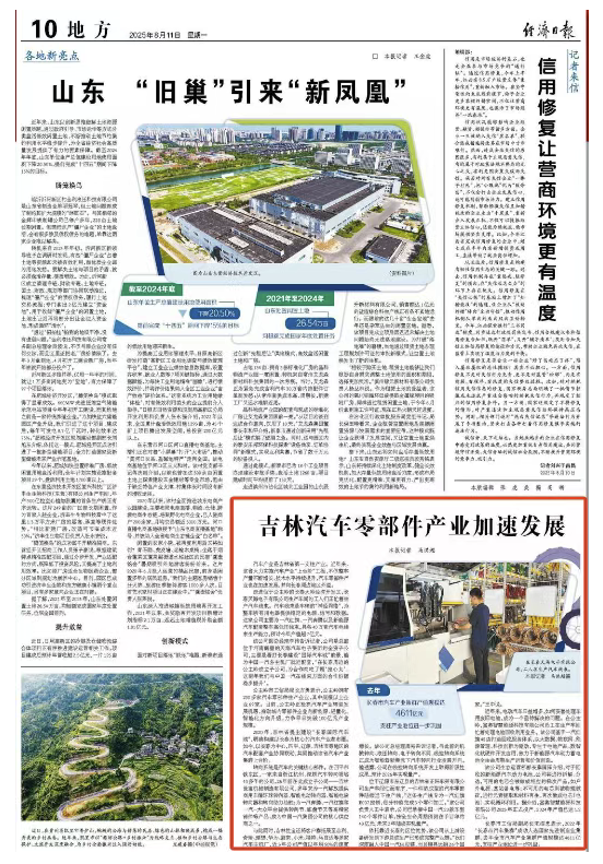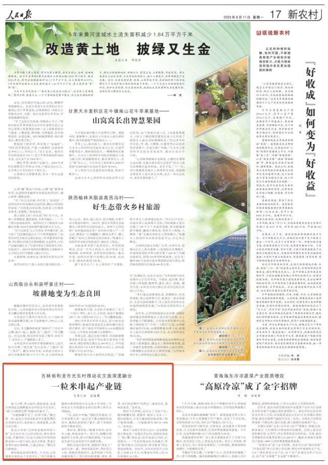 新华每日电讯一版头题推出《守山脉 兴水脉 承文脉 绿美吉林与文化吉林的双向奔赴》,报道吉林完整准确全面贯彻新发展理念,山脉、水脉、文脉“三脉”交响,掀开强基固本、聚势蓄能、提质焕新的新篇章。人民日报推出《吉林省和龙市光东村推动农文旅深度融合 一粒米串起产业链》,报道和龙市光东村推动农文旅融合,形成“稻田观光+民俗体验+研学教育”的全域旅游格局所取得的成效。经济日报推出《吉林汽车零部件产业加速发展》,报道吉林省大力实施汽车产业“上台阶”工程,推动汽车零部件产业加速发展所取得的成就。